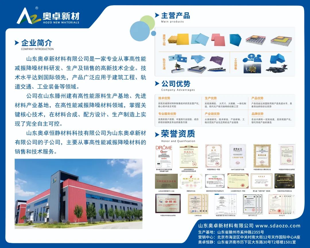 山東奧卓新材料有限公司是一家專業(yè)從事高性能減振降噪材料研發(fā)、生產(chǎn)及銷售的高新技術(shù)企業(yè)。技術(shù)水平達(dá)到國際領(lǐng)先,產(chǎn)品廣泛應(yīng)用于建筑工程、軌道交通、工業(yè)裝備等領(lǐng)域。